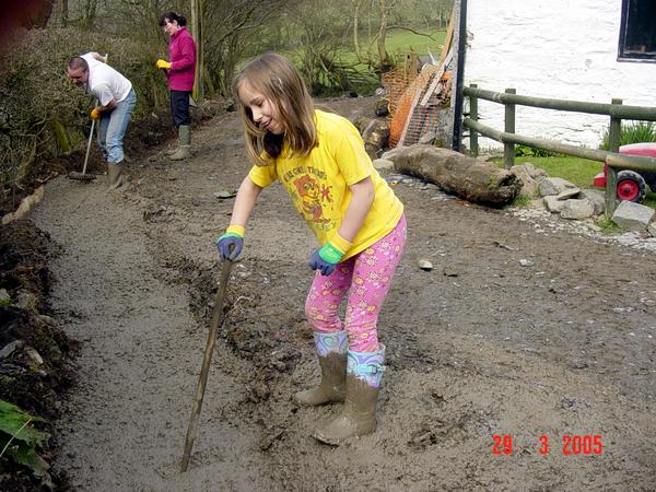 The hard work starts, shovelling & raking it to all the places we could not tip directly into.